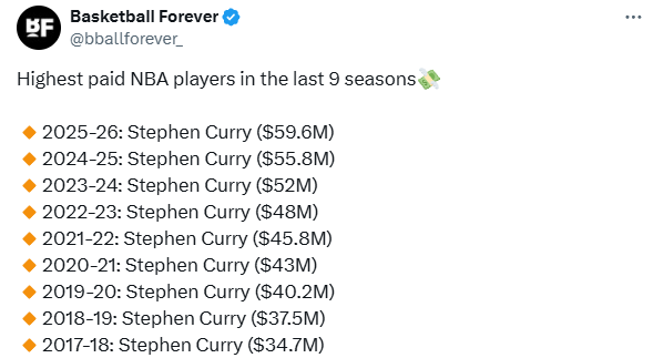 2025-26赛季:斯蒂芬-库里(5960万美元)